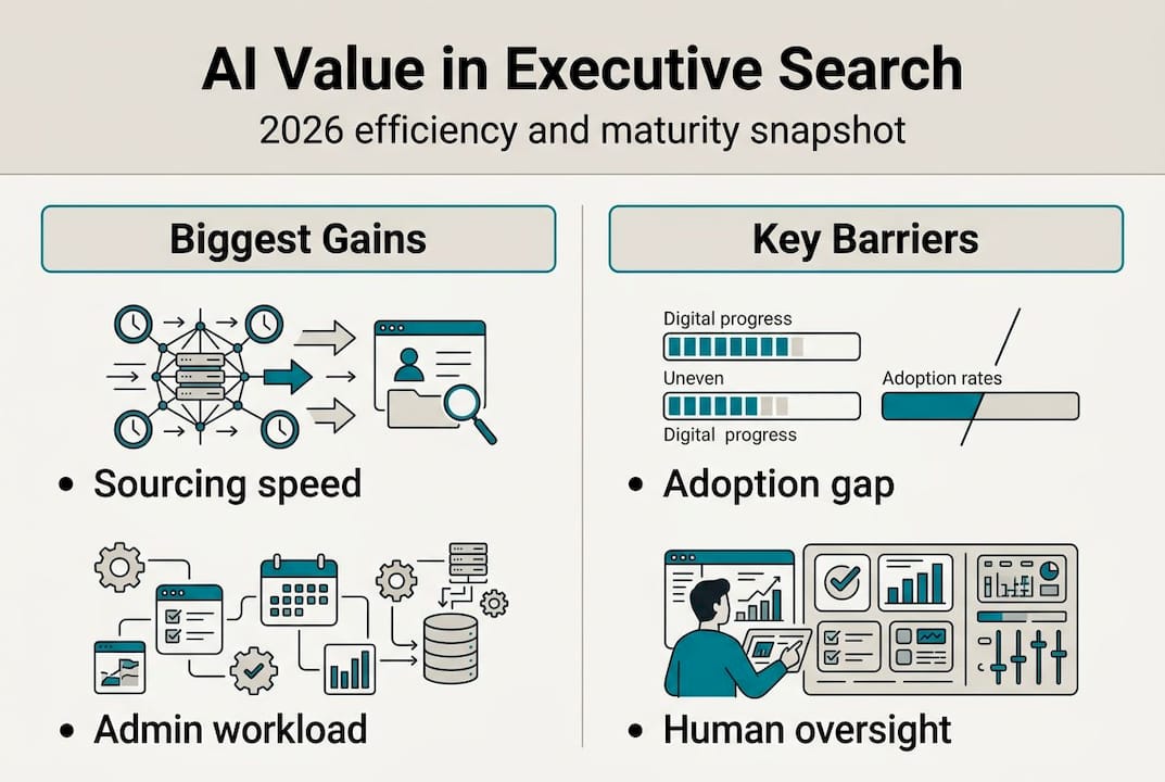 AI's measurable gains in speed and volume do not translate uniformly to executive search outcomes. AI struggles with nuanced leadership fit; assessing whether a candidate has the judgment, cultural alignment, and interpersonal influence required at the C-suite level remains beyond what current tools handle reliably. Harvard Business Review's 2026 analysis concluded that hybrid human-AI approaches are necessary precisely because the highest-stakes dimensions of senior hiring resist algorithmic resolution.