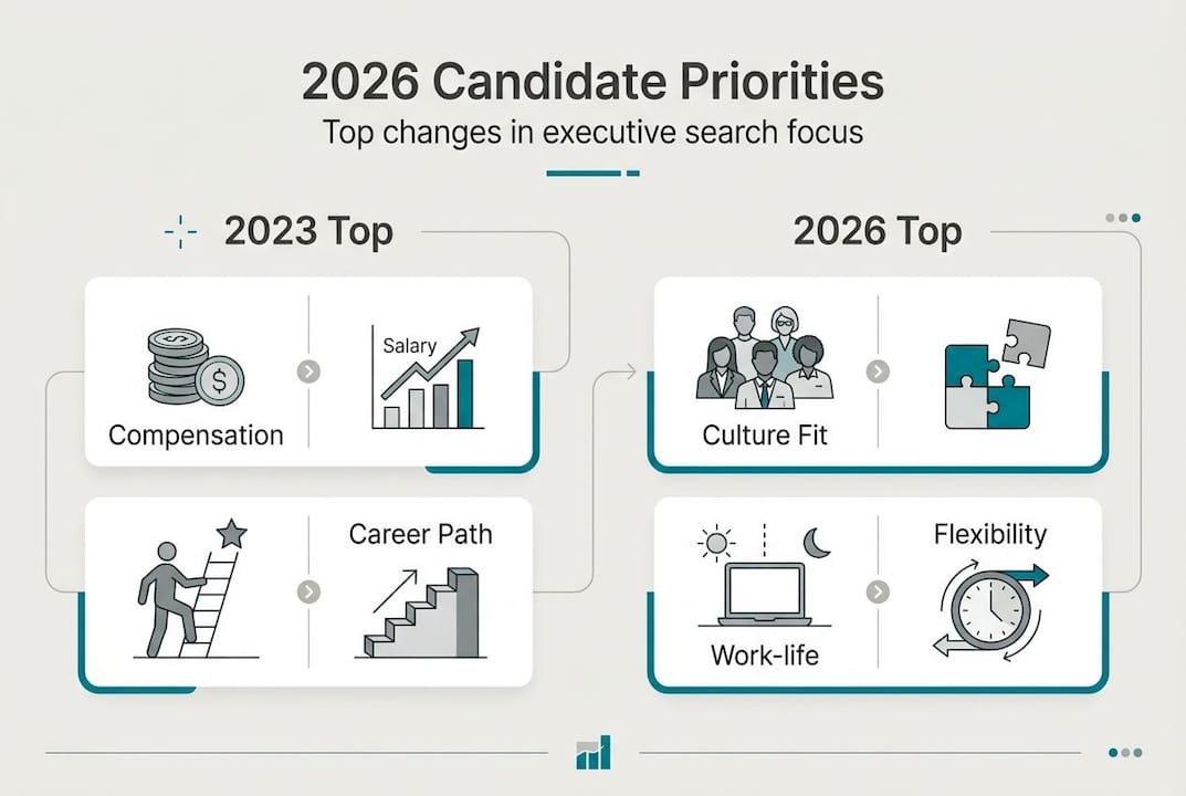 Flexibility, culture, and purpose now lead executive candidates' priorities in 2026, with compensation ranking fourth. Development opportunities and career pathways round out the top five.