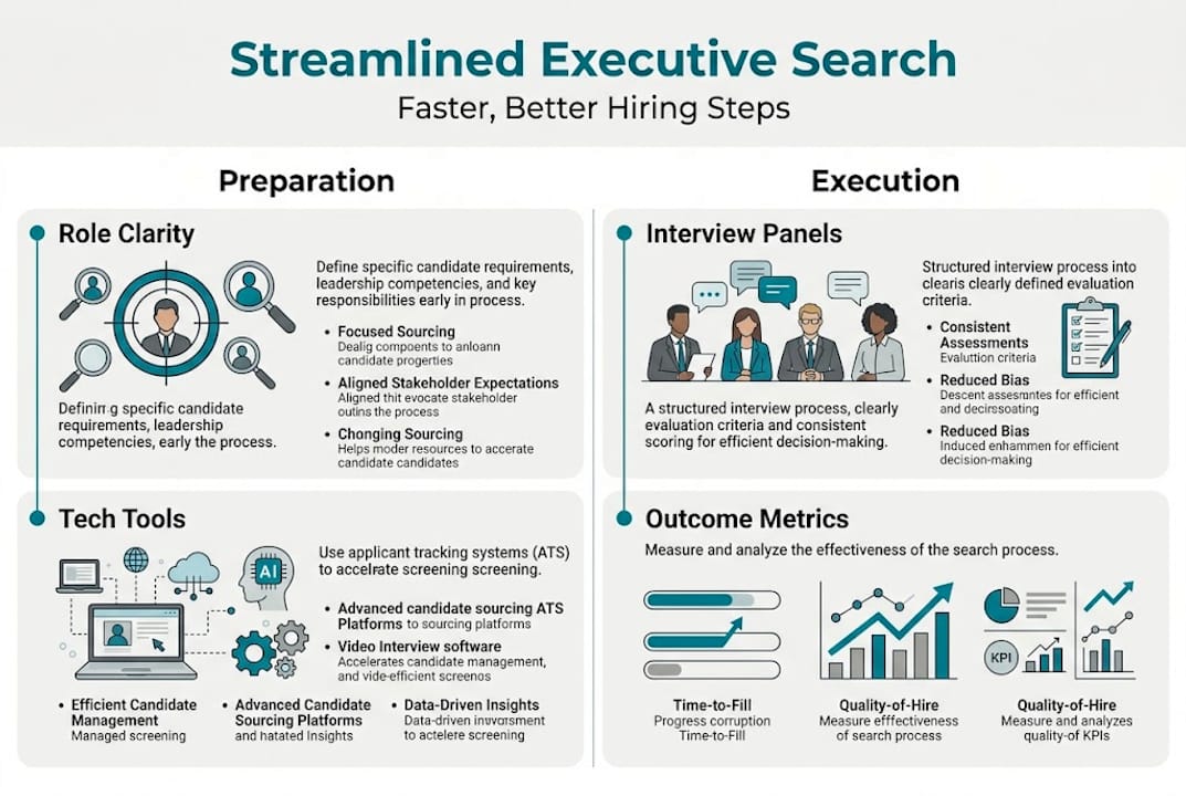 An executive search that drags on for six months doesn't just delay a hire. It stalls strategic initiatives, strains teams, and signals organizational dysfunction to the very candidates you're trying to attract. For large organizations, a slow or mismanaged search process compounds quickly, burning recruiter bandwidth, exhausting stakeholder patience, and risking the loss of top-tier candidates to faster-moving competitors. The good news is that most delays are preventable. Retention can increase 20-30% with structured post-hire planning, and the same discipline applied earlier in the process pays equally large dividends. This guide walks you through each phase of a streamlined executive search, from preparation through onboarding.